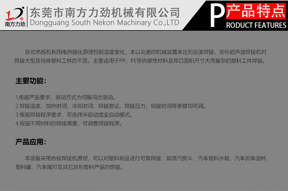 臥式熱板對接機是臥式熱板機的新型機。相對普通的立式而言,長度不受限制。廣泛運用于法蘭盤、汽車尾箱、油箱、尾氣凈器、空氣過濾器等大型塑料件、異性件。根據(jù)焊接面,臥式熱板機分為單面焊、雙面焊、對焊等不同規(guī)格,根據(jù)工件結(jié)構(gòu),選擇最佳的分模設(shè)計方案,增強焊接面的牢固性。降低熔接深度。提高生產(chǎn)效率和產(chǎn)品合格率。